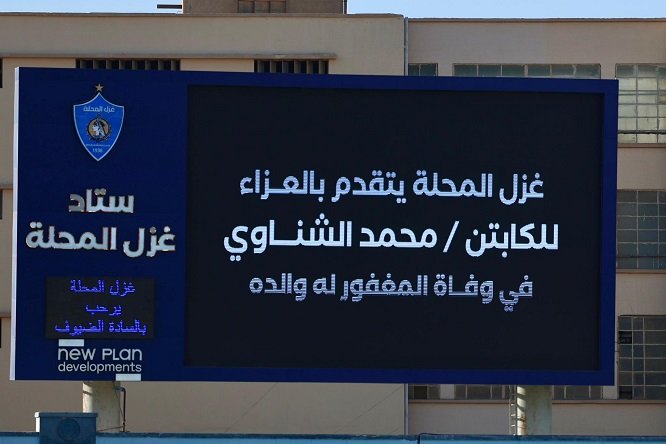 وعبر اللوحة الإلكترونية لاستاد غزل المحلة تم نشر رسالة تعزية كُتب فيها: “غزل المحلة يتقدم بالعزاء للكابتن محمد الشناوي، في وفاة المغفور له والده”.