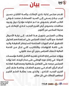 وطالب المجلس بإحالة الملف إلى نيابة الأموال العامة للتحقيق فيه، مؤكدًا استعداد أعضائه للمثول أمام الجهات المختصة لعرض كافة الحقائق والرد على ما وصفوه بالاتهامات الباطلة التي تمس ذمتهم المالية دون أي دليل قانوني.