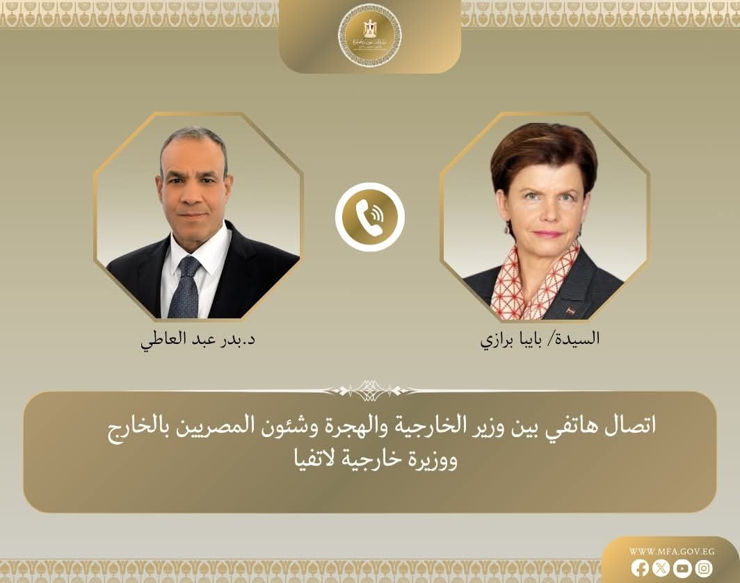 تلقى د. بدر عبد العاطي وزير الخارجية والهجرة وشئون المصريين بالخارج يوم السبت ٣٠ أغسطس اتصالًا هاتفيًا من السيدة بايبا برازي وزيرة خارجية جمهورية لاتفيا، حيث تناول الاتصال مسار العلاقات الثنائية بين البلدين، والقضايا الإقليمية ذات الاهتمام المشترك.