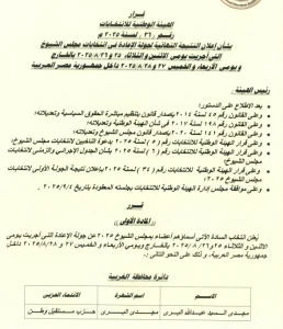 أصدرت الهيئة الوطنية للانتخابات القرار رقم 36 لسنة 2025، بشأن إعلان النتيجة النهائية لجولة الإعادة في انتخابات مجلس الشيوخ في الداخل والخارج، والتي أجريت يومى 25 و26 أغسطس في الخارج، ويومى 27 و28 أغسطس في الداخل.