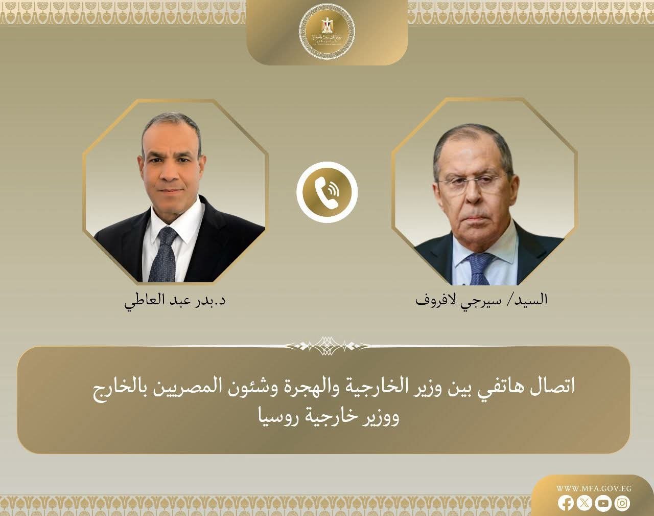 جرى اتصال هاتفي، يوم الاحد 16 نوفمبر 2025، بين د. بدر عبد العاطي وزير الخارجية والهجرة وشئون المصريين بالخارج، وسيرجي لافروف وزير خارجية روسيا الاتحادية، وذلك في إطار التشاور المستمر بين البلدين حول العلاقات الثنائية والقضايا الإقليمية والدولية ذات الاهتمام المشترك.