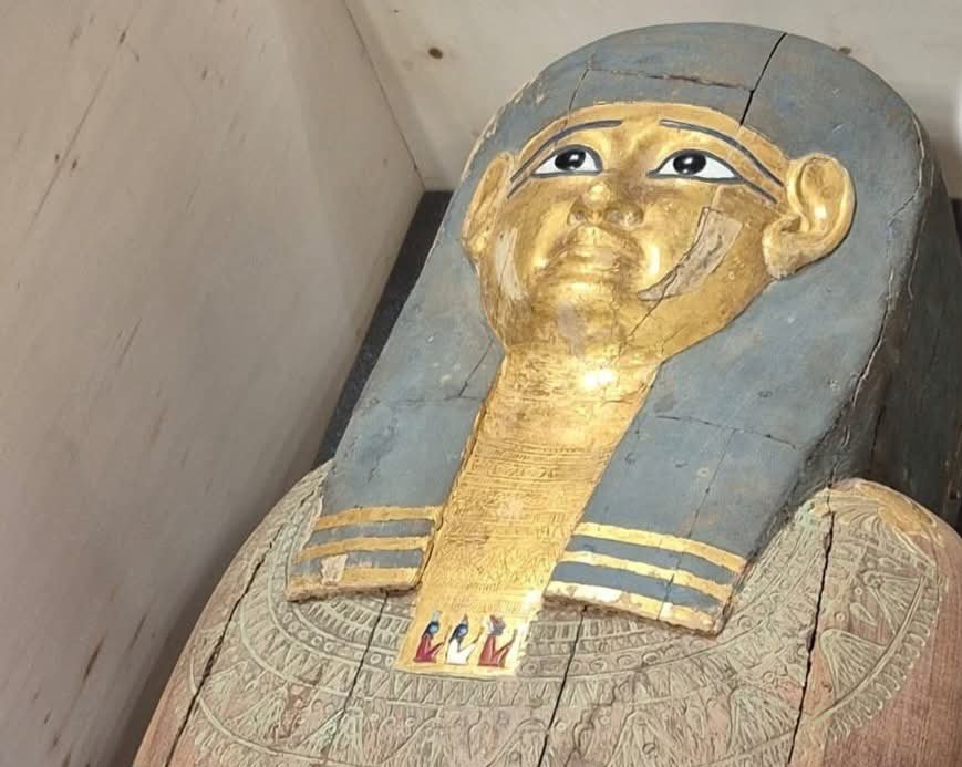 القطع الأثرية المستردة عبارة عن تابوت خشبي مطلي ومذهب من العصر المتأخر، ويتميز بزخارفه الدقيقة التي تعكس الطقوس الجنائزية وتقنيات صناعة التوابيت في ذلك العصر، بالإضافة إلى لحية خشبية أثرية كانت جزءًا من تمثال مصري قديم، من عصر الدولة الوسطى، وتمثل نموذجًا لأحد العناصر الرمزية المهمة في فن النحت المصري القديم.