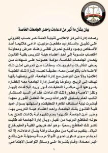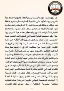 كما وجهت إدارة الجامعة رسالة رسمية لكافة طلابها وأعضاء هيئة التدريس بها، لحثهم على التقدم بأية معلومات أو شكاوى متعلقة بما تم نشره، وذلك في سرية تامة، إلا أنه لم يتقدم أحد، فبادرت إدارة الجامعة بالإبلاغ ضد الناشر سالف الذكر؛ لنشره وإذاعته تلك الأخبار الكاذبة بقصد التشهير بالجامعة وأعضاء هيئة التدريس بها.
