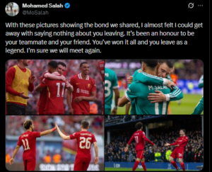 أضاف محمد صلاح في رسالته لروبرتسون أنه كان شرفاً كبيراً له أن يكون زميلاً وصديقاً للاعب حقق كل شيء ممكن مع النادي ويرحل الآن وهو يحمل لقب “الأسطورة” في قلوب الجماهير، وأعرب النجم المصري عن ثقته الكاملة في أن الأيام ستجمعهما مجدداً سواء داخل الملعب أو خارجه نظراً للعلاقة القوية التي بنيت بينهما خلال رحلة الكفاح والنجاح في الدوري الإنجليزي، وتأتي هذه الرسالة في وقت يستعد فيه الفريق لإجراء تغييرات فنية واسعة بعد موسم حافل شهد رحيل عدد من الركائز الأساسية التي ساهمت في استعادة ليفربول لمكانته المحلية والقارية.