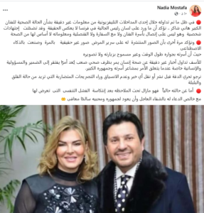 وحرصت نادية مصطفى على توضيح حقيقة الوضع الصحي، عبر منشور لها على موقع فيسبوك، مؤكدة أن ما تم تداوله خلال إحدى المداخلات التليفزيونية بشأن حالته غير دقيق، مشيرة إلى أن التصريحات المنسوبة لرئيس الجالية في فرنسا لا تستند إلى مصادر موثوقة، وأنها مجرد اجتهادات شخصية لا تعكس الواقع.