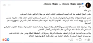 وأوضح الدفاع عبر حسابه الشخصي على “فيسبوك” أن هذه الخطوة تأتي استجابةً للبلاغ المقدم من زوجة الراحل، بهدف كشف ملابسات الوفاة والوصول إلى الحقيقة كاملة، والتحقق من وجود شبهة جنائية أو إهمال من عدمه.